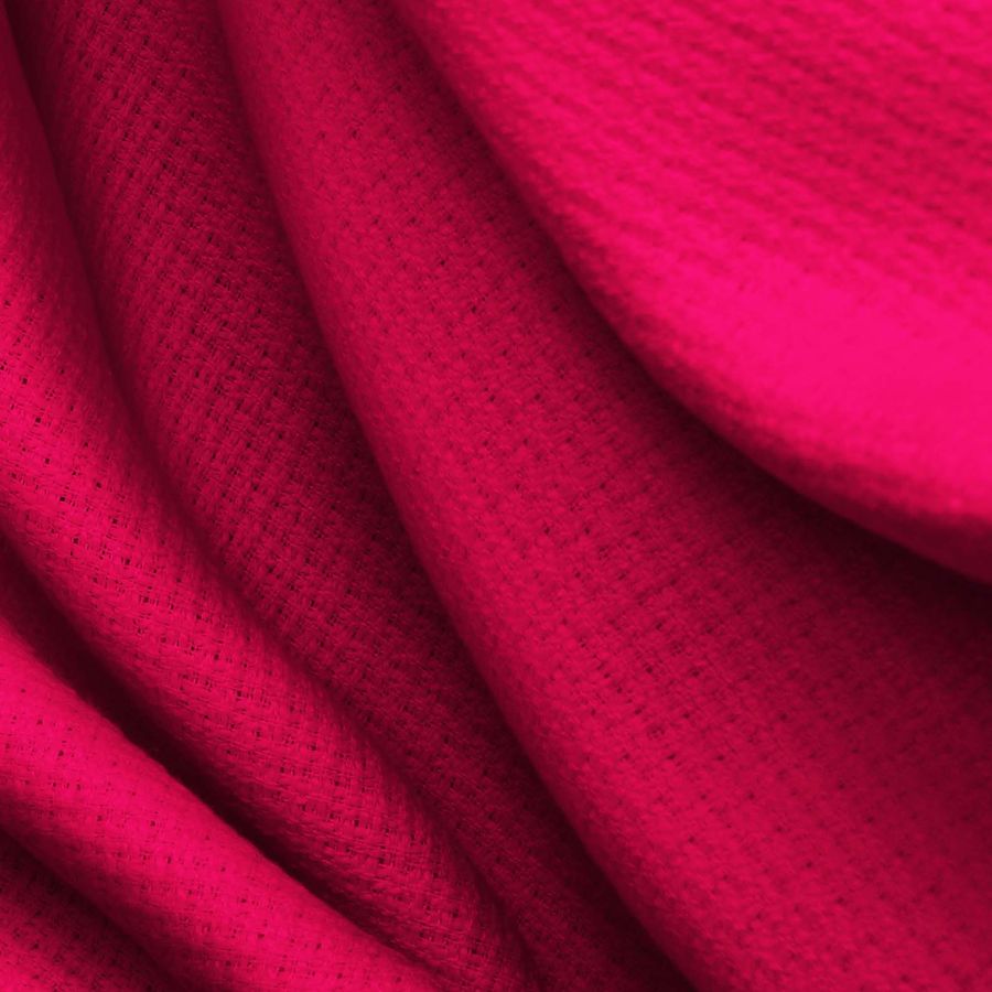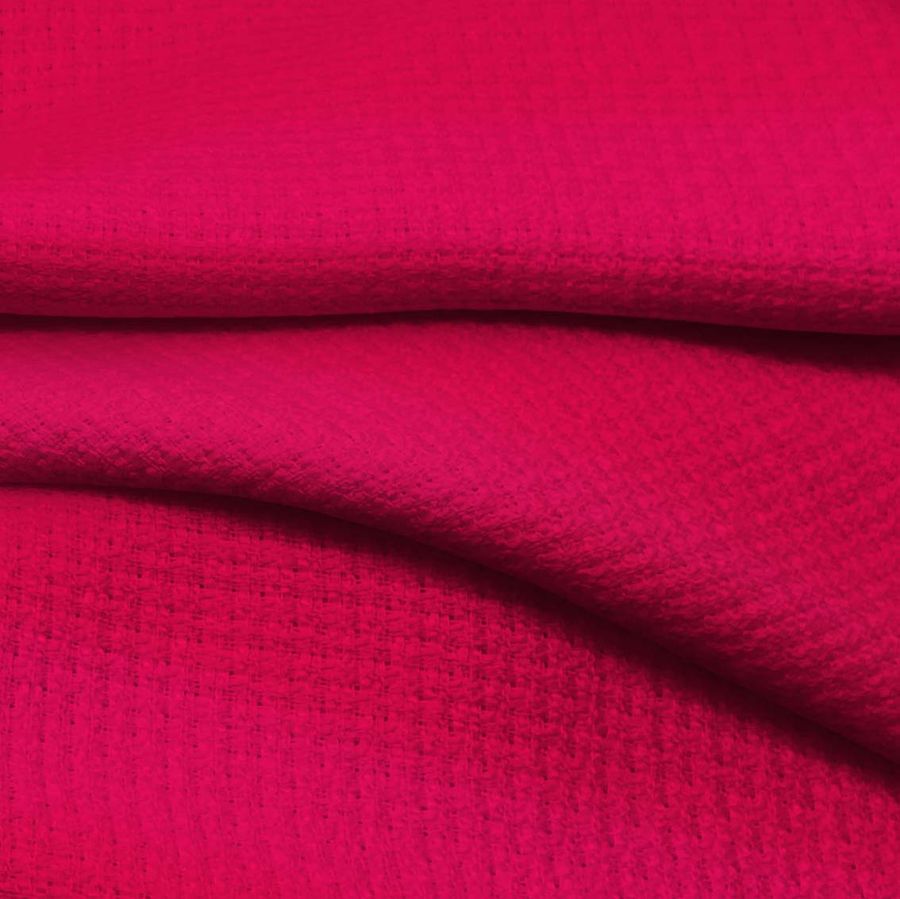 La tela base del tweed Chanel es de composición 100% poliéster con un gramaje de 420 gr/m2 y un ancho de 150 cm. Su color liso impreso es rojo con un matiz de pinzón rosado, correspondiendo a un CMYK de 3 99 59 0. Este color rojo-pinza combina a la perfección con tonos grises y azules claros. Es importante destacar que el tejido está impreso a una sola cara por impresión digital textil.