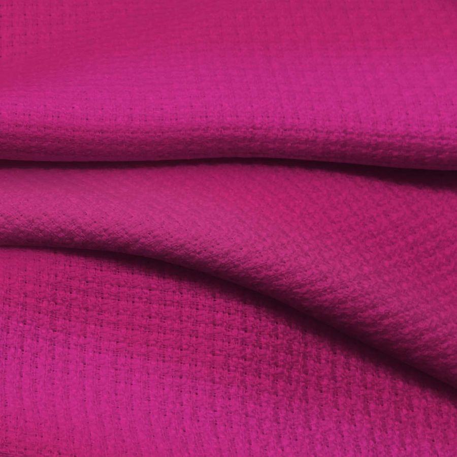 La tela base de este tejido es el Tweed- Chanel, 100% poliéster, con un gramaje de 420 gr/m2 y un ancho de 150cm. El color liso impreso es un rojo cereza con una combinación de tintas cyan-22, magenta-96, yellow-22 y black-6, con un CMYK de 22 96 22 6. Este color vibrante se combina muy bien con tonalidades marrones y grises.