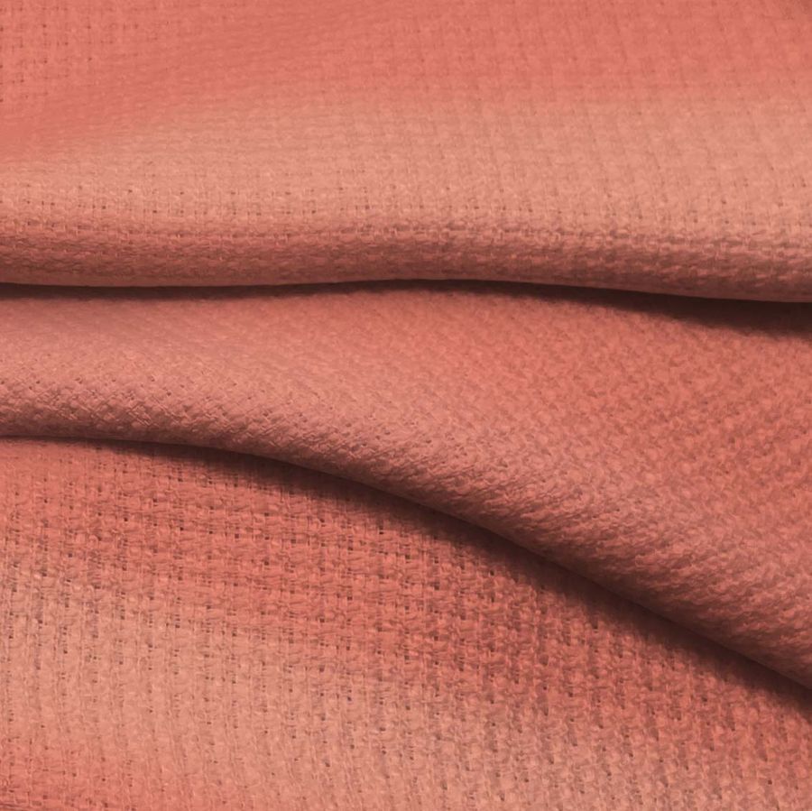 La tela base es el Tweed - Chanel, un tejido de tipo tweed compuesto por 100% poliéster, con un gramaje de 420 gr/m2 y un ancho de 150 cm. El color liso impreso es de un tono rojo pastel con una tinta Cyan de 3, una tinta Magenta de 63, una tinta Yellow de 55 y una tinta Black de 0, lo que da como resultado un CMYK de 3 63 55 0. El color secundario es un tono perfectamente equilibrado entre rojo y rosa, lo que crea una ilusión de frescura y juventud. Este color combina muy bien con otros tonos pastel, como azules claros o verdes agua.