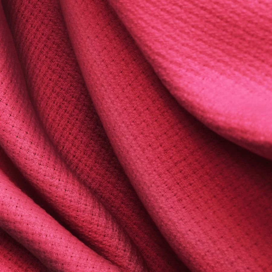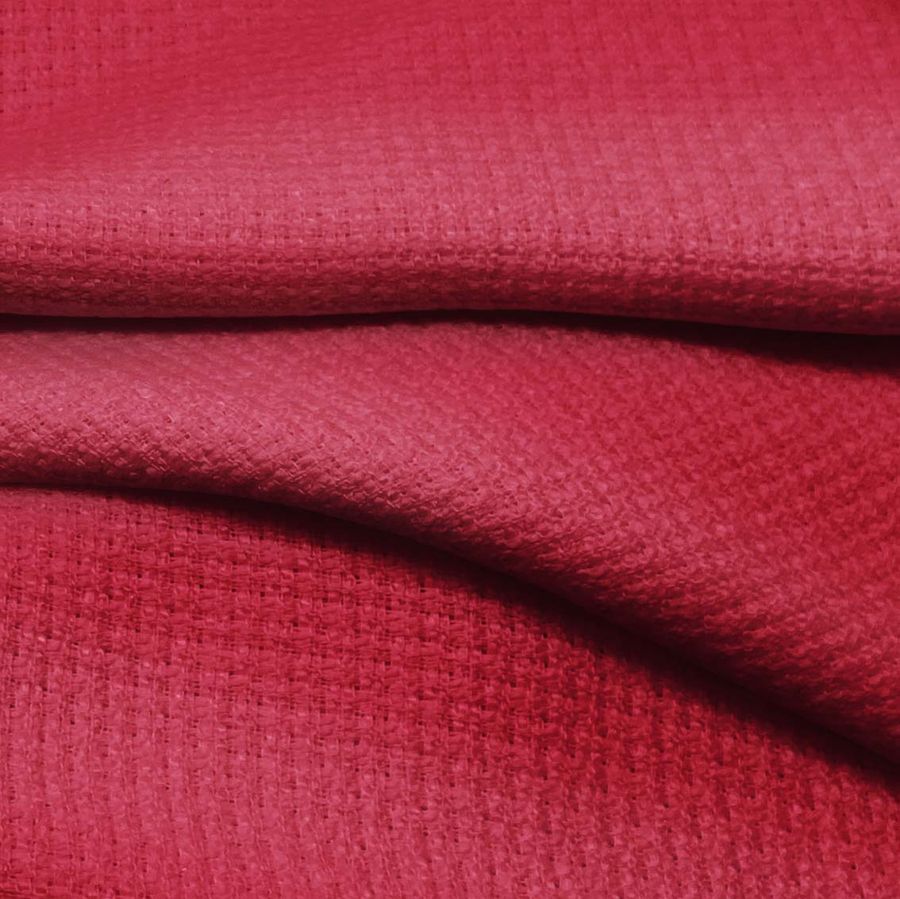 La tela base es un Tweed Chanel de 100% poliéster con un gramaje de 420 gr/m2 y un ancho de 150 cm. El color liso impreso es Rojo Rubí con un CMYK de 22 96 67 14, lo que nos indica que es un color vibrante y intenso con una alta saturación de magenta y amarillo. Este color nos remite a la pasión, a la sensualidad y al lujo. Combina especialmente bien con tonos neutros como el blanco, el beige y el gris, así como con otros colores fuertes como el azul y el verde oscuro.