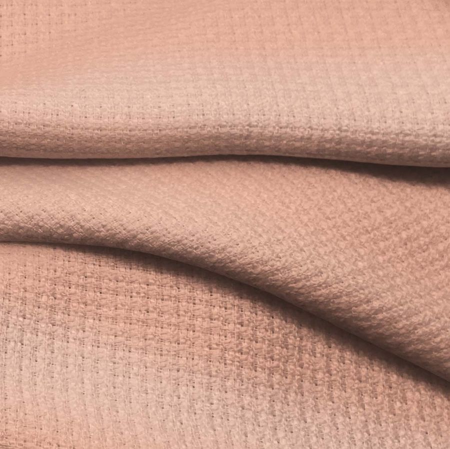 La tela base Tweed-Chanel es un tejido de poliéster con un gramaje de 420 gr/m2 y un ancho de 150 cm. Su color liso impreso es un tono rojo-salmón con una combinación CMYK de 0 38 37 0. Este color inspira lo cálido y lo dulce, es ideal para transmitir un aire de frescura y femineidad. Este color se puede combinar con tonos marrones, beige, verdes y azules pastel.