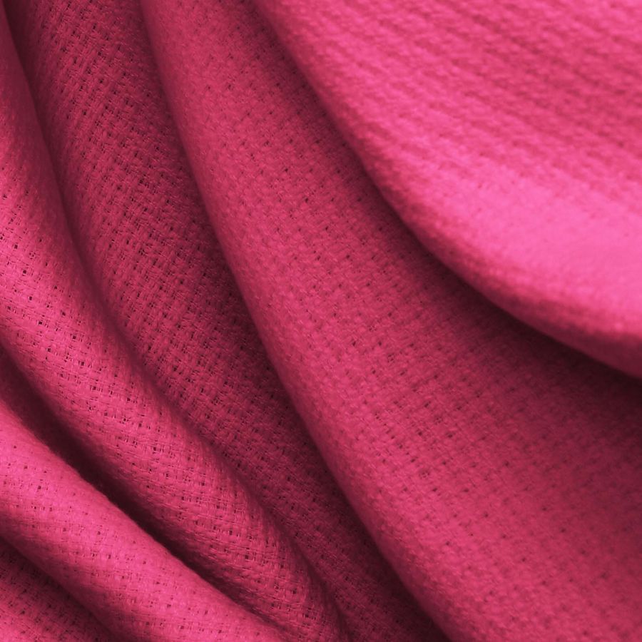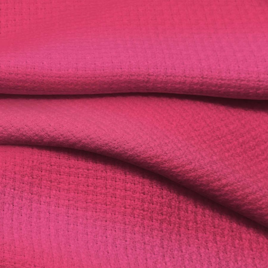 La tela base Tweed - Chanel es un tejido tweed de 420 gr/m2 compuesto por 100% poliéster y con un ancho de 150 cm. El color liso impreso es rojo borgoña claro, con una tinta magenta del 85% y una tinta amarilla del 36%, reflejado en el CMYK 0 85 36 0. Este color secundario se describe como intenso y sofisticado, con una gran personalidad y vitalidad al mismo tiempo. Se combina perfectamente con colores como el negro, el blanco y el beige, así como con tonos fríos como el gris y el azul.