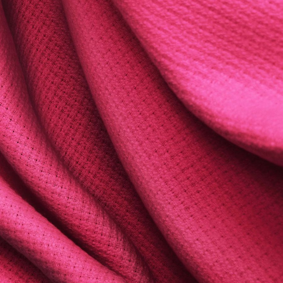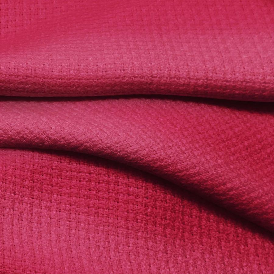 La tela base Tweed - Chanel es un tejido de tipo tweed, fabricado con un 100% de poliéster, con un gramaje de 420 gr/m² y un ancho de 150 cm. La tela tiene una textura rígida al tacto, lo que la convierte en ideal para aplicaciones en moda y decoración. En cuanto al color liso impreso, este es de un rojo intenso, cercano al Rioja, con un CMYK de 20 96 57 12. Este color secundario es símbolo de pasión, fuerza y vitalidad. Se trata de un color cálido y vibrante que se combina perfectamente con tonos neutros como el gris y el beige, así como con matices oscuros de negro o azul.