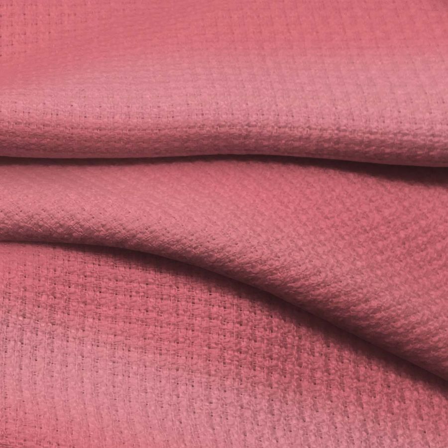La tela base de nuestro material es el Tweed - Chanel, de composición 100% poliéster, con un gramaje de 420 gr/m2 y un ancho de 150 cm. El color liso impreso es un vibrante Rojo Coral, con una combinación de tinta cian de 5, magenta de 67, amarillo de 40 y negro de 0, lo que se traduce en un cian de bajo valor, uno alto de magenta y un amarillo moderado. Este color simboliza la pasión y la energía, inspira la confianza en uno mismo y ayuda a atraer la atención. Combinado con tonos neutros como el blanco, gris o negro, este tono puede dar vida a cualquier diseño.