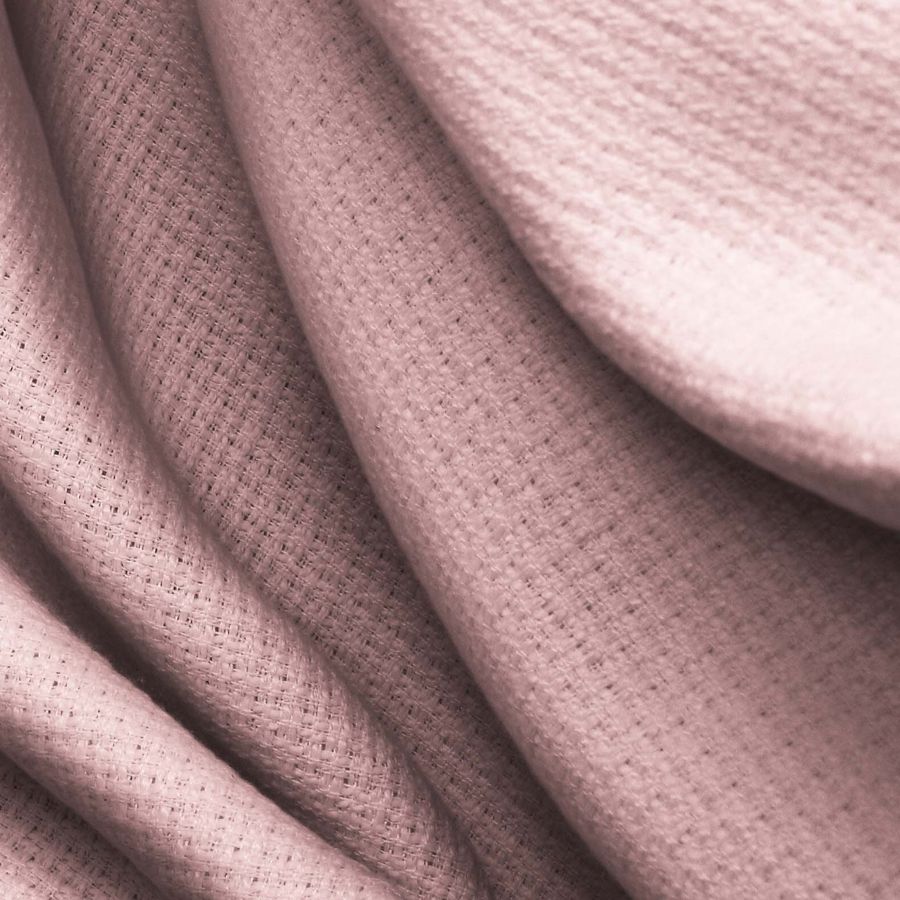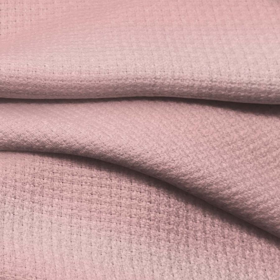 La tela base es un Tweed - Chanel de composición 100% poliéster, de gramaje 420 gr/m2 y ancho de 150 cm. En cuanto al color liso impreso, se trata de una combinación de rosa y albaricoque cuyo CMYK es 2 36 22 0. Este color secundario es una mezcla suave y delicada que representa la frescura y la creatividad, y combina perfectamente con tonos neutros como el gris y el beige.