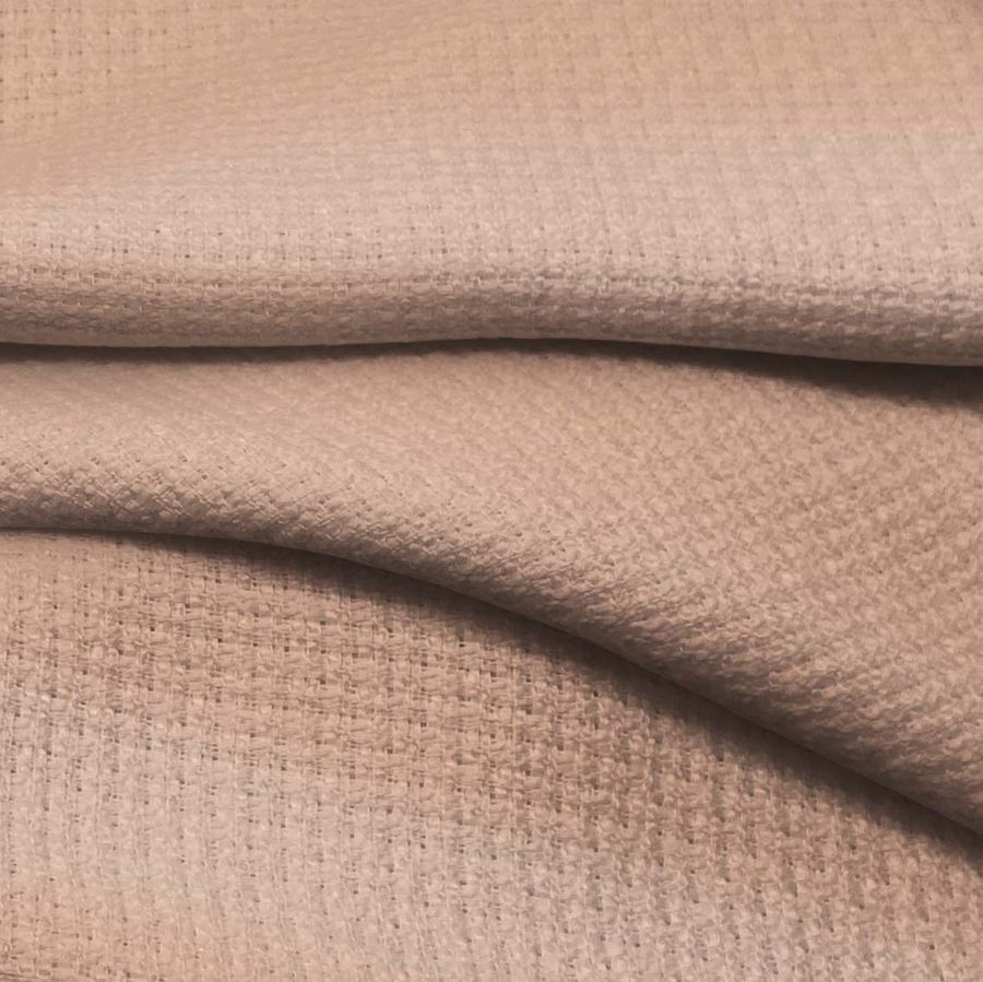 La tela base es el Tweed - Chanel, compuesta por 100% poliéster con un gramaje de 420 gr/m2 y un ancho de 150 cm. El color liso impreso en esta tela es el Rosa Arena del Desierto, que se genera con el siguiente CMYK: 12 36 40 2, lo que se traduce en un color con tonos cálidos y suaves. Es un color complementario del verde militar y del marrón, lo que le añade una gran versatilidad al combinarlo con otras tonalidades.