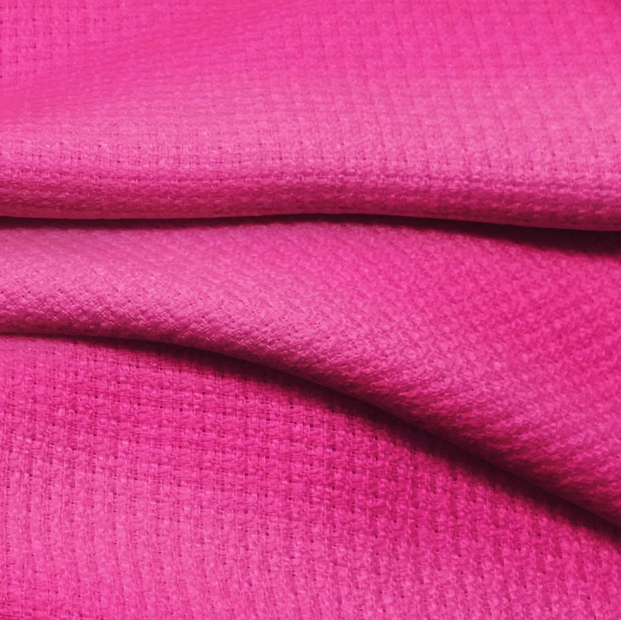 La tela base es el Tweed - Chanel, un tejido de poliéster de 420 gr/m2, con un ancho de 150 cm. El color liso impreso es un Rosa Barbie con un CMYK de 0 86 10 0. Este color es un tono femenino y dulce que se combina perfectamente con colores neutros como el blanco, el gris y el beige, así como con tonos pastel como el azul celeste y el lila.