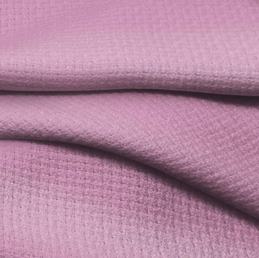 La tela base es el Tweed - Chanel, 100% poliéster con un gramaje de 420gr/m2 y ancho de 150cm. El color liso impreso es Rosa Cadillac con un CMYK de 15 50 8 0. Este color simboliza amor, romanticismo y seducción, y técnicamente tiene una saturación media y una tonalidad rosada con matices azules. Combina especialmente bien con tonos verdes y azules, así como con tonos neutros como el gris o el beige. La tela base está impresa con el color liso a una sola cara por impresión digital textil, lo que implica que la tinta penetra en la superficie de la tela para conseguir un acabado duradero.