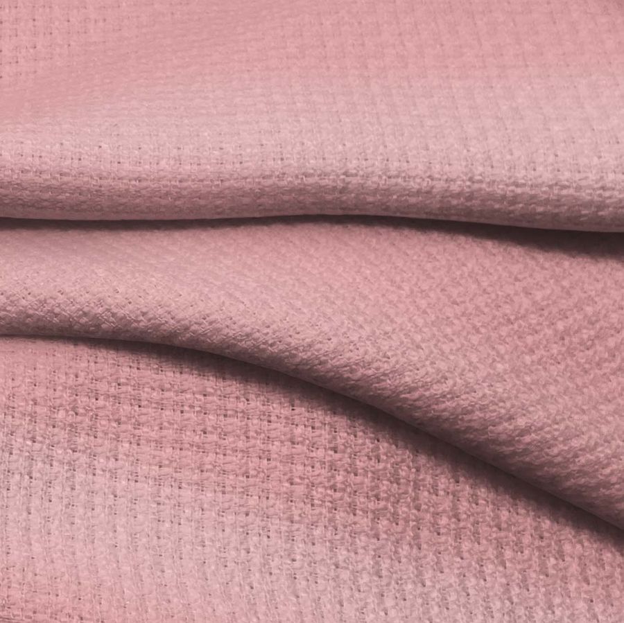 La tela base es el Tweed - Chanel, un tejido de tipo tweed con una composición de 100% POLIÉSTER y un gramaje de 420 gr/m2, con un ancho de la tela de 150cm. El color liso impreso es de un rosa clavel, con un CMYK de 4 45 25 0. Este color secundario se caracteriza por ser un rosa oscuro y profundo, con un toque de morado que lo hace muy elegante y sofisticado. Combina especialmente bien con tonos claros como blanco, beige, rosa clarito, pero también con colores oscuros como negro, gris o azul marino.