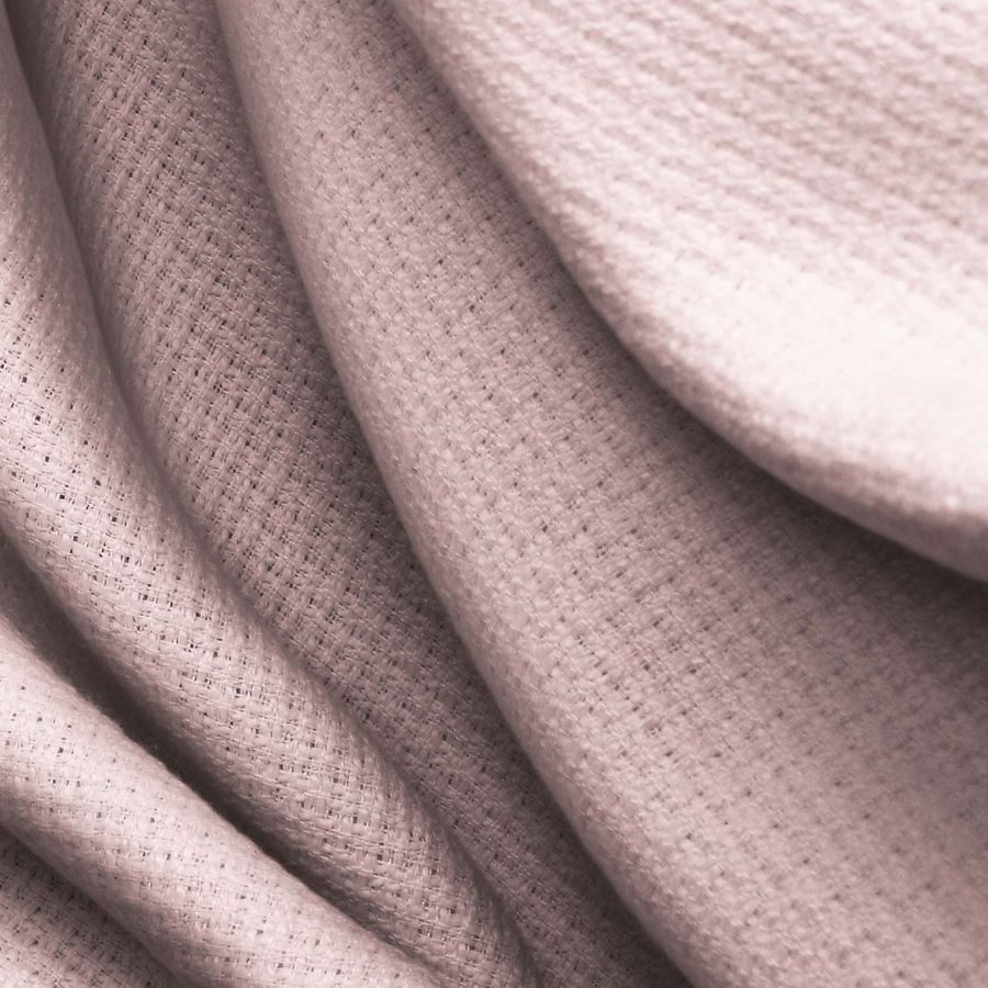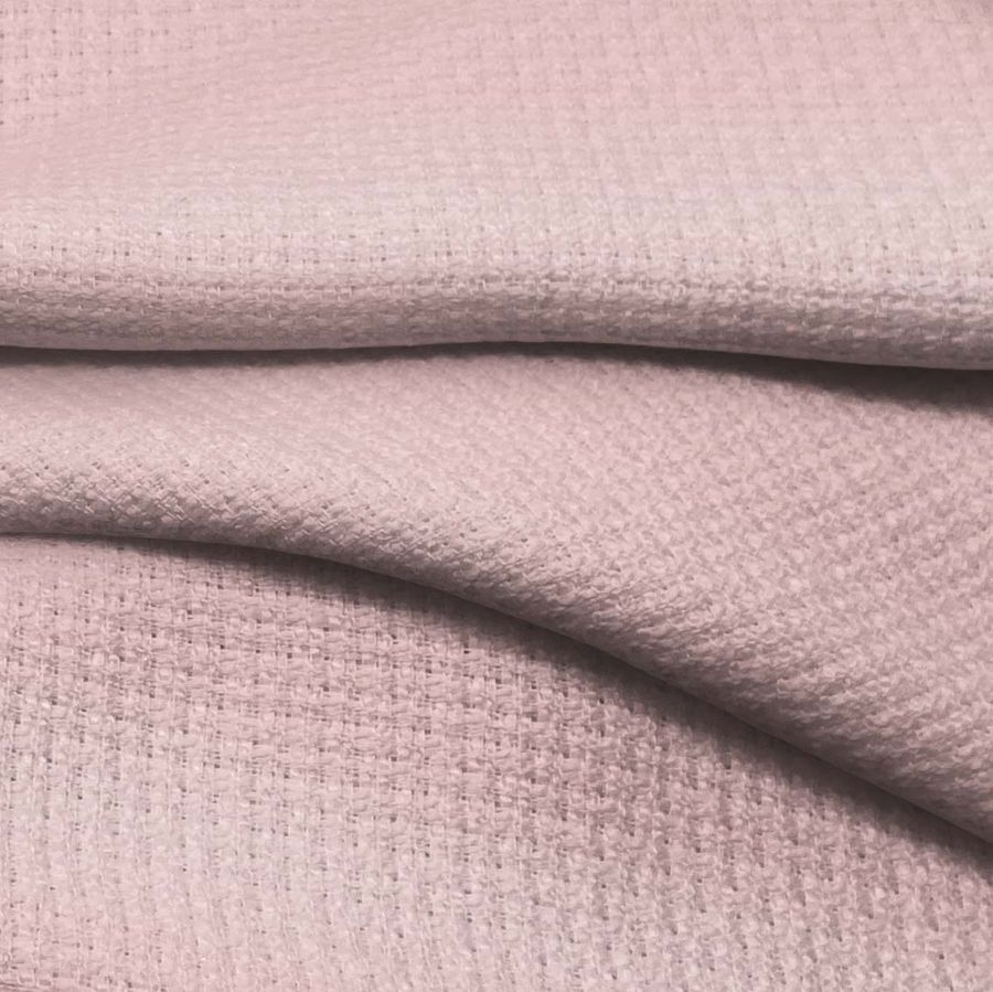 La tela base es un Tweed Chanel de poliéster con un gramaje de 420 gr/m2 y un ancho de 150 cm. El color impreso es un Cuarzo Rosa con un CMYK de 1 28 16 0. Este rosa es suave y delicado, transmitiendo una sensación de calma y sosiego al que lo observa. Este color es combinable con tonos como el gris, el negro, el blanco y el beige.