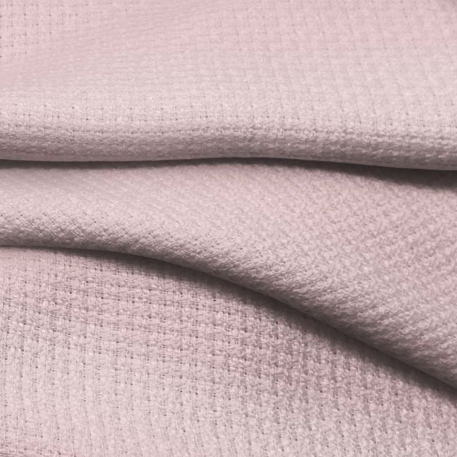 La tela base es un tweed de Chanel compuesto por 100% poliéster con un gramaje de 420 gr/m2 y una anchura de 150 cm. Su color liso impreso es rosa dogwood, con una combinación de tinta cyan de 2, magenta de 24, yellow de 13, y black de 0, representado en su CMYK de 2 24 13 0. Este color secundario es un tono rosa fuerte con un matiz melocotón cálido, que aporta energía y vitalidad. Se combina bien con tonalidades de verde, azul y amarillo, creando una sensación de contraste y equilibrio.