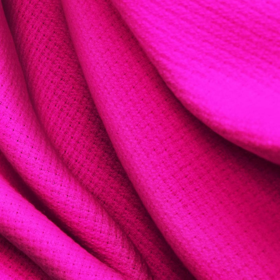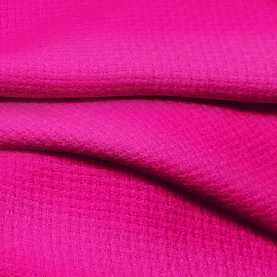 La tela base es un Tweed - Chanel de 420 gr/m2 con una composición del 100% poliéster, con un ancho de 150cm, sin embargo, lo más destacable de este tejido es su color Rosa Fucsia que se logra mediante la tinta magenta con un 93% de intensidad y una mínima aportación de tinta amarilla (7%). Este color se puede describir como un rosa vibrante, valiente y audaz, que proyecta energía y vitalidad, ideal para añadir una nota de luminosidad a cualquier prenda o accesorio. Este color es perfecto para combinar con otros tonos brillantes como el amarillo, el turquesa o el verde manzana, creando una atmósfera llena de vida y optimismo. Es importante destacar que este tejido está impreso con el color liso a una sola cara por impresión digital textil, lo que significa que no es un tejido tintado, sino impreso por una sola cara con tecnología de sublimación.