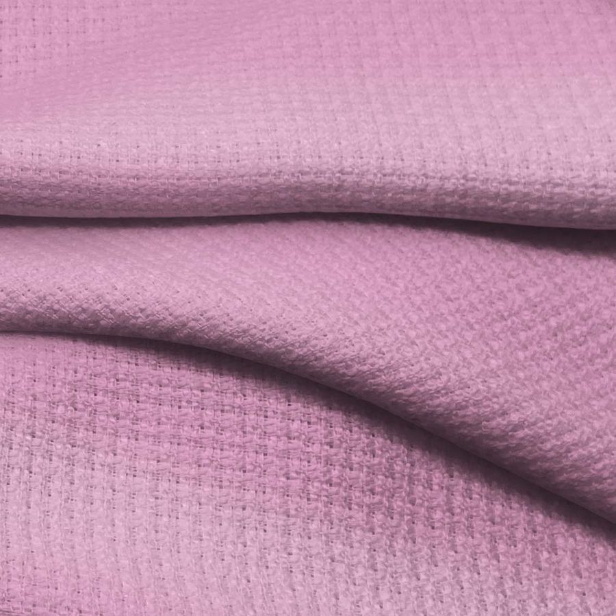 La tela base se trata de un tweed Chanel, compuesto al 100% por poliéster, de gramaje 420 gr/m2, con un ancho de 150 cm y una textura rígida al tacto. El color liso impreso es Rosa-Kobi, con una mezcla de tintas de 7% de cian, 48% de magenta, 2% de amarillo y 0% de tinta negra, lo que da como resultado un color vibrante y atractivo. Este color secundario es una tonalidad rosa claro pero cálido, que simboliza la dulzura y el romance. Combina bien con colores neutros como tonos grises o beige, y también con otros tonos rosados más vivos o con tonos verdes como el menta o el esmeralda.