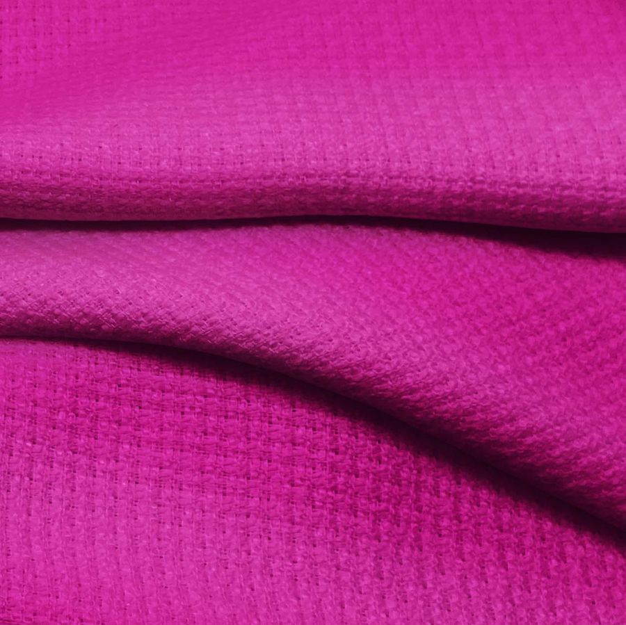 La tela base es un tweed de poliéster de 420gr/m2, de 150cm de ancho, con cuidados específicos para el lavado y planchado. El color liso es rosa medio violeta rojo con un CMYK de 22 96 0 0, impreso en una sola cara por sublimación. La tonalidad rosa simboliza la alegría y la pasión, mientras que el violeta rojo trae equilibrio y sofisticación. Este color combina perfectamente con tonos neutros como el gris y el beige, y resalta con tonos dorados y plateados.