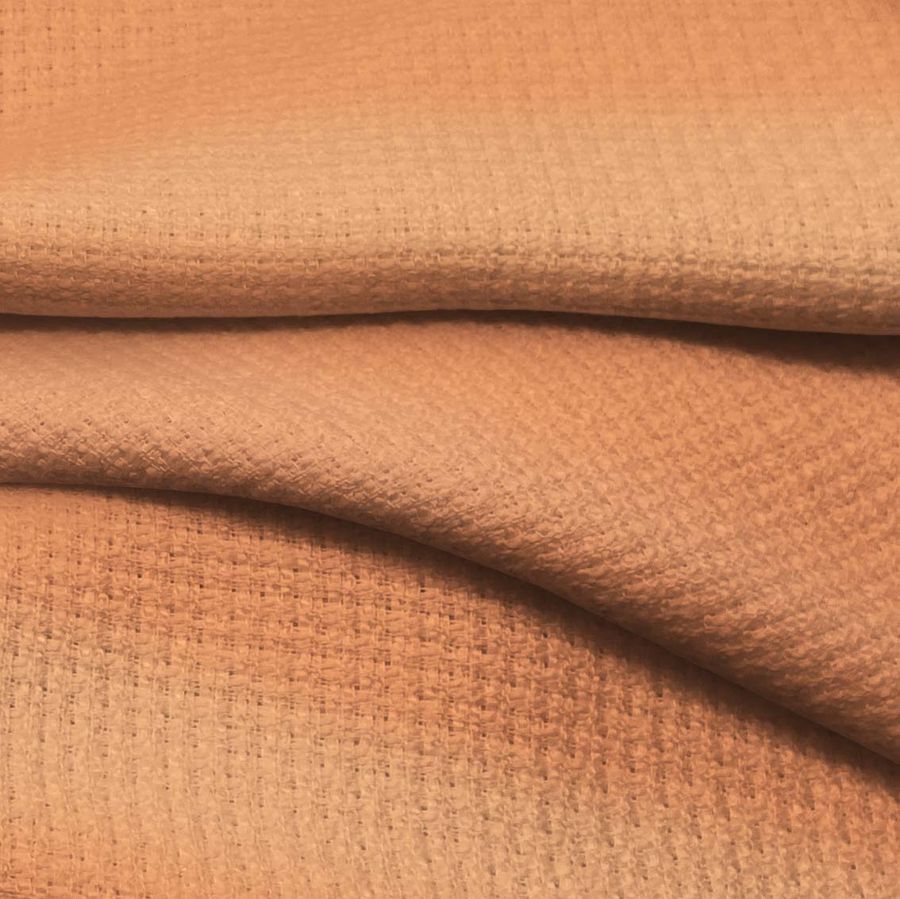 La tela base es un Tweed - Chanel, compuesta al 100% de poliéster con un gramaje de 420 gr/m2 y 150 cm de ancho. El color liso impreso es Rosa Naranja, con una tinta magenta de 51 y una tinta yellow de 60, dando un CMYK de 0 51 60 0. Este color simboliza la pasión y la alegría, además de resaltar la energía y vitalidad. Técnicamente, el rosa-naranja es un tono cálido y vivaz que combina perfectamente con tonos pastel o neutros.