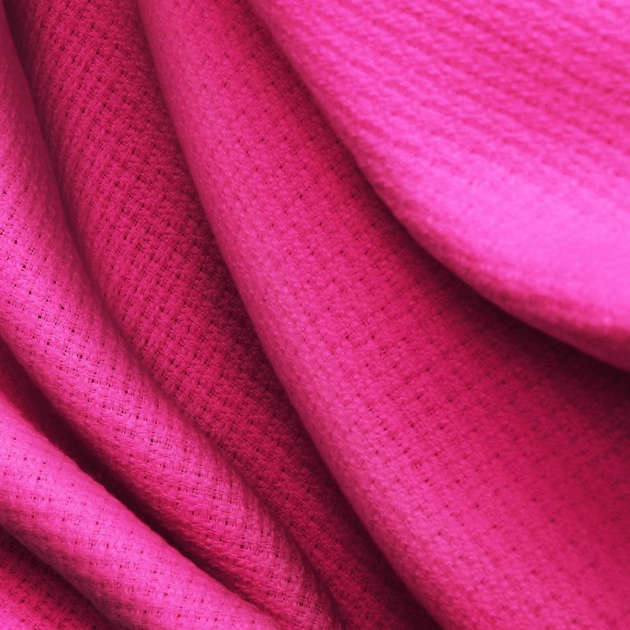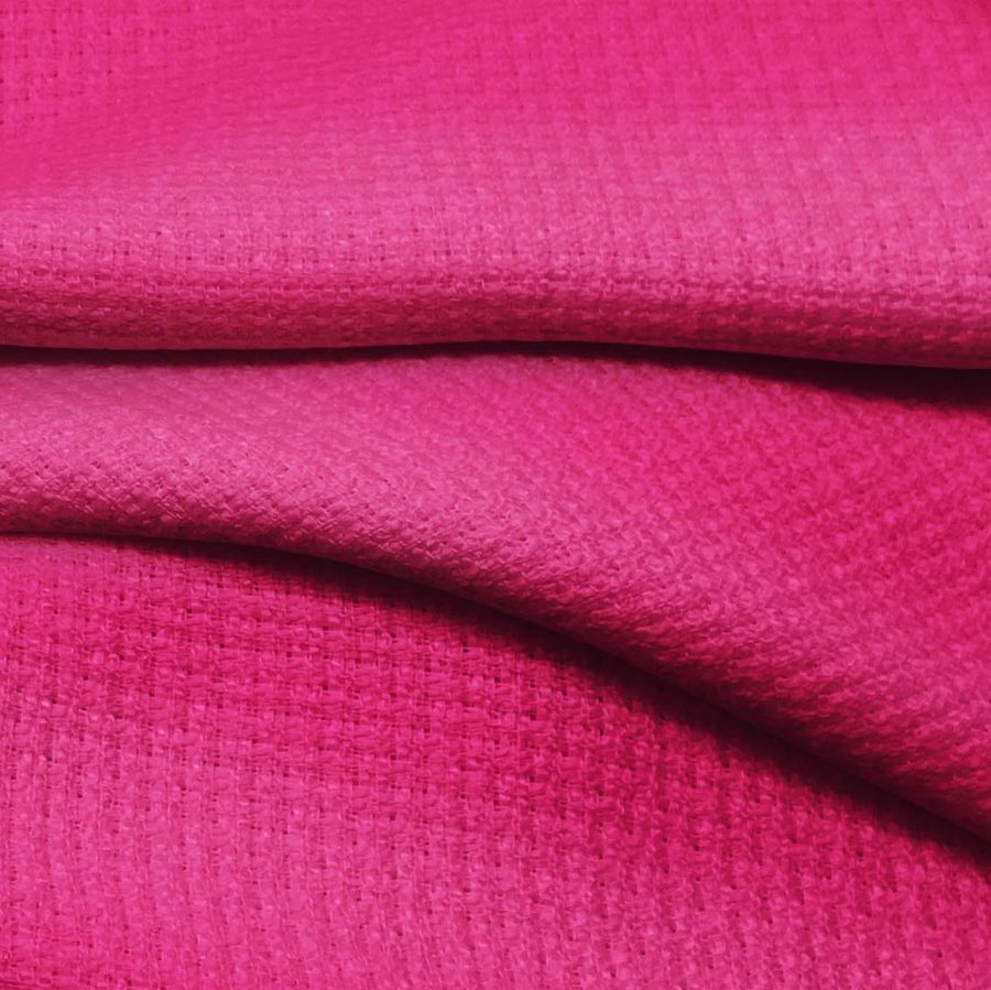 La tela base es el Tweed-Chanel, un tejido de tweed compuesto por 100% poliéster con un gramaje de 420 gr/m2 y un ancho de 150 cm. El color liso impreso es el rosa razzmatazz, que viene representado por un CMYK de 2, 94, 29, 0, siendo su pigmentación principalmente magenta con un toque amarillo. Este color simboliza el amor y la pasión, y se combina perfectamente con tonos oscuros como el negro y el gris. Este tejido se imprime a una sola cara por impresión digital textil, no siendo un tejido tintado sino impreso de forma digital.