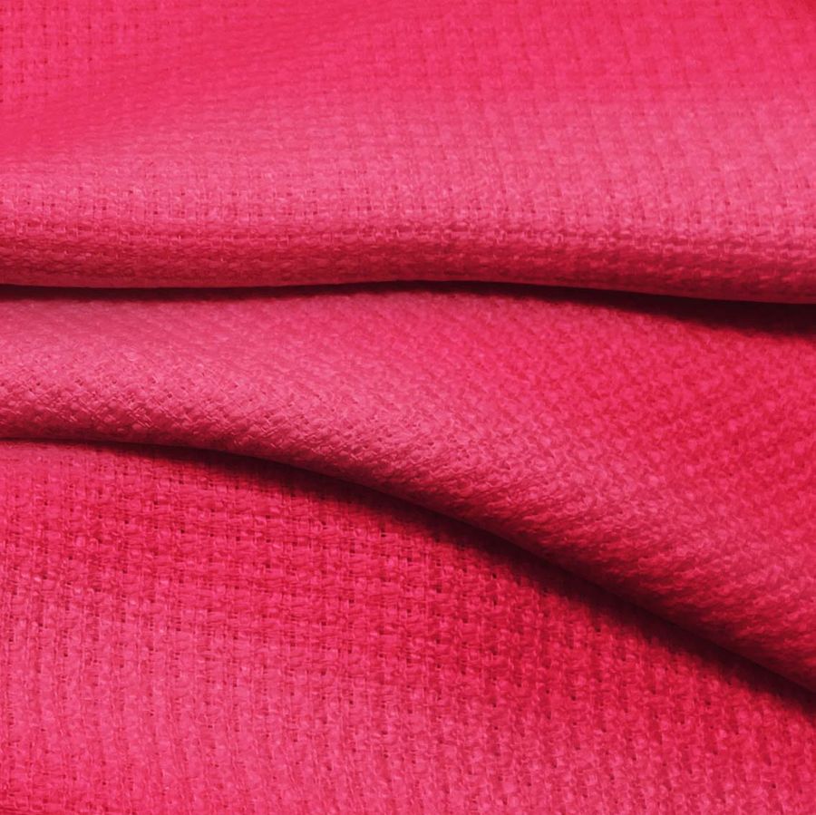 El Tweed-Chanel es una tela de Tweed compuesta por 100% POLIÉSTER, con un peso de 420 gr/m2 y un ancho de 150 cm. El color liso impreso combinado de rosa y rojizo, con una tinta magenta predominante (CMYK 0 90 51 0). El color secundario aporta una sensación de energía y pasión. Este color combina bien con colores neutros como el gris o el negro, además de tonos cálidos como el dorado o el beige. Impreso a una sola cara con impresión digital textil. La textura es rígida al tacto.