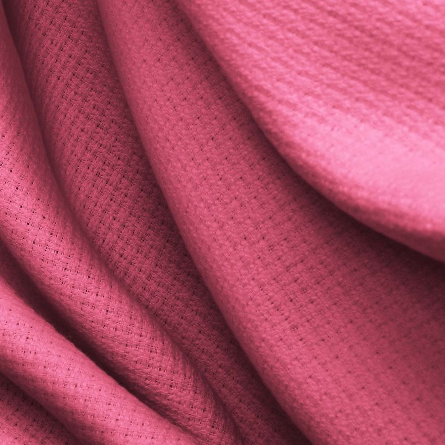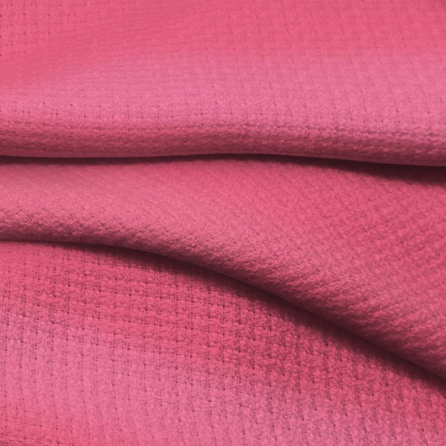 La tela base del tejido es el Tweed Chanel, un tejido tweed compuesto al 100% de poliéster con un gramaje de 420 gr/m2 y un ancho de 150 cm. El color liso impreso en el tejido es Rosa Brink, que se consigue mediante la combinación de 0% de tinta cyan, 75% de tinta magenta, 29% de tinta yellow y 0% de tinta black, lo que da un valor CMYK de 0 75 29 0. El color secundario es un rosa intenso con un toque magenta, que combina bien con tonos neutros como el gris y el beige, pero también funciona bien con tonos similares como el rosa pálido y el rosa chicle.