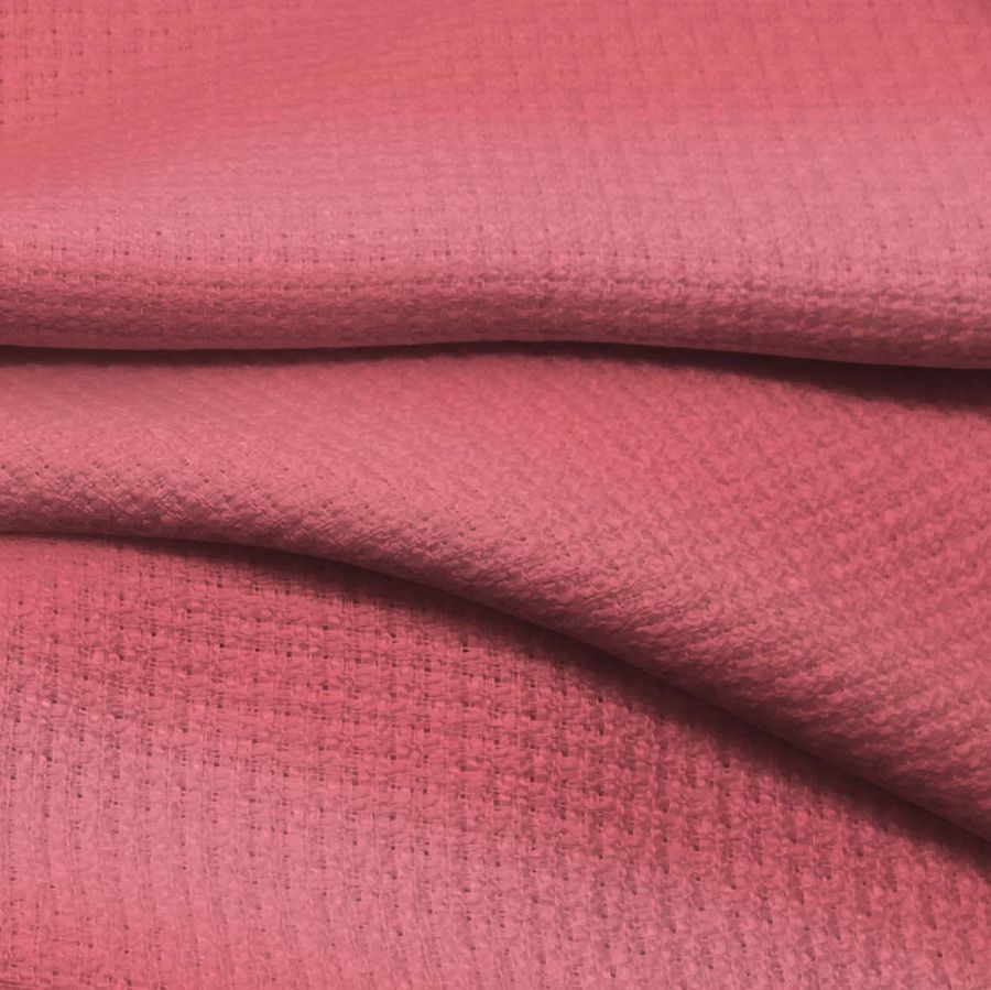 La tela base de esta prenda es un tweed de chanel, compuesto en su totalidad por poliéster con un gramaje de 420 gr/m2 y una anchura de 150 cm. El color liso impreso es una tonalidad de rosa claro carmín, que se obtiene a través de la tecnología de sublimación con un CMYK de 4 72 44 0.