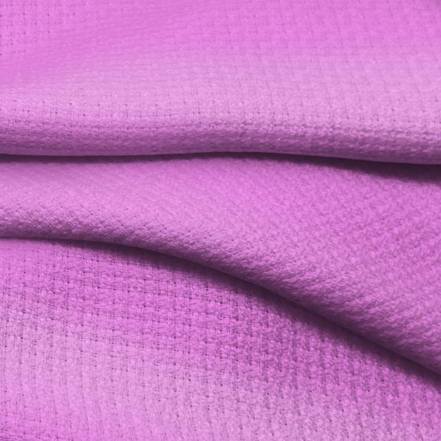 La tela base Tweed - Chanel es un tejido de poliéster con un gramaje de 420 gr/m2 y un ancho de 150 cm. Su color liso impreso es un rosa claro fucsia, con una mezcla de tintas de 20 en cian y 55 en magenta, sin usar amarillo ni negro, por lo que se ajusta a un CMYK de 20 55 0 0. Este color es elegante y sofisticado, ideal para prendas y accesorios de moda. Combina especialmente con tonos neutros, como negro, gris o blanco.