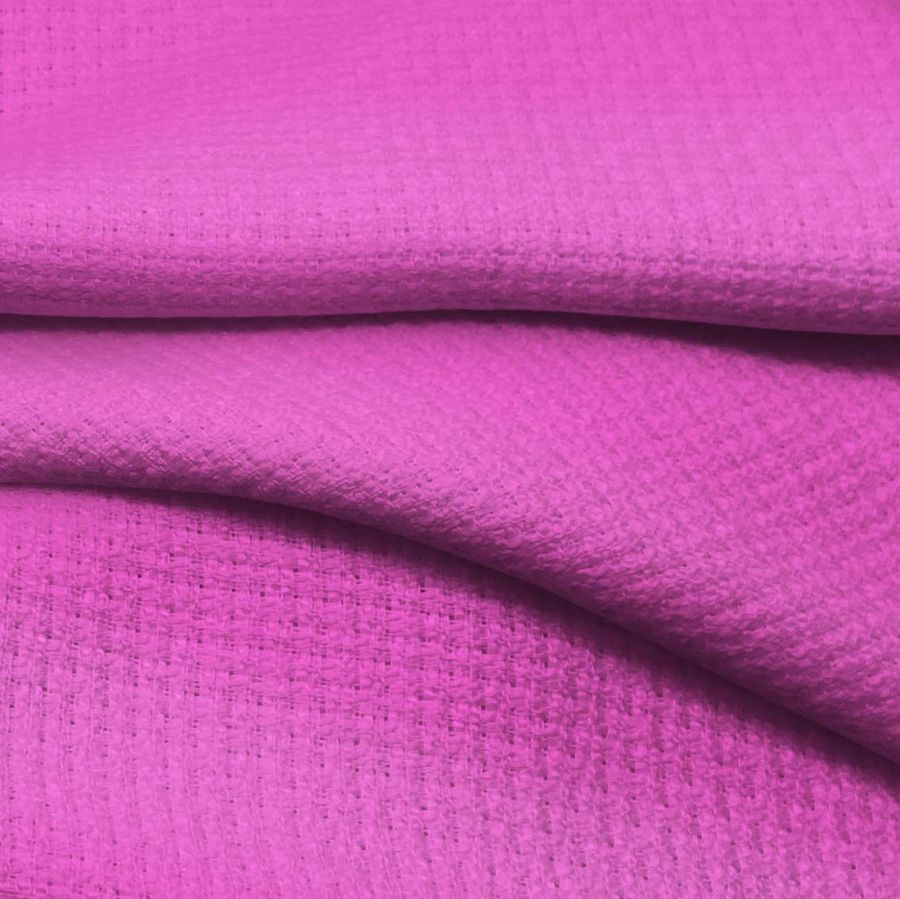 La tela base Tweed – Chanel es un tejido de Tweed 100% poliéster con un gramaje de 420 gr/m2 y un ancho de 150 cm. El color liso impreso en este tejido es un rosa claro oscuro, con una combinación de tinta cian del 15%, magenta del 70%, amarillo del 0% y negro del 0%, lo que se traduce en un perfil CMYK de 15 70 0 0. Este color simboliza la energía de la juventud y la vitalidad, pero también la dulzura y la delicadeza.