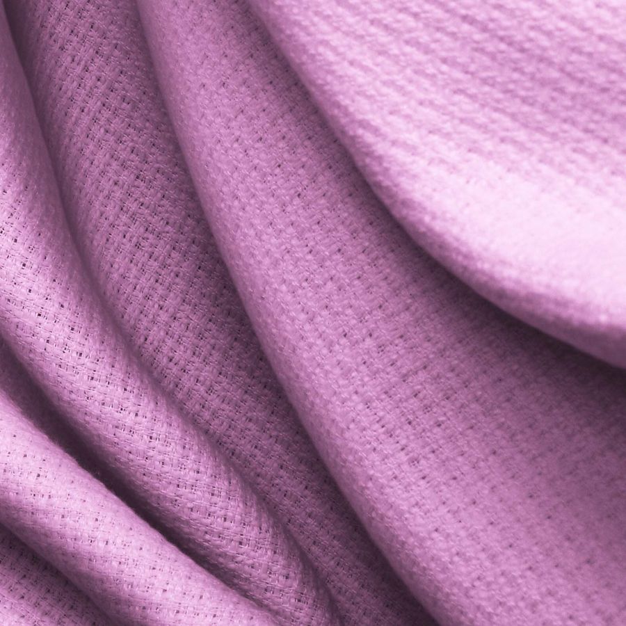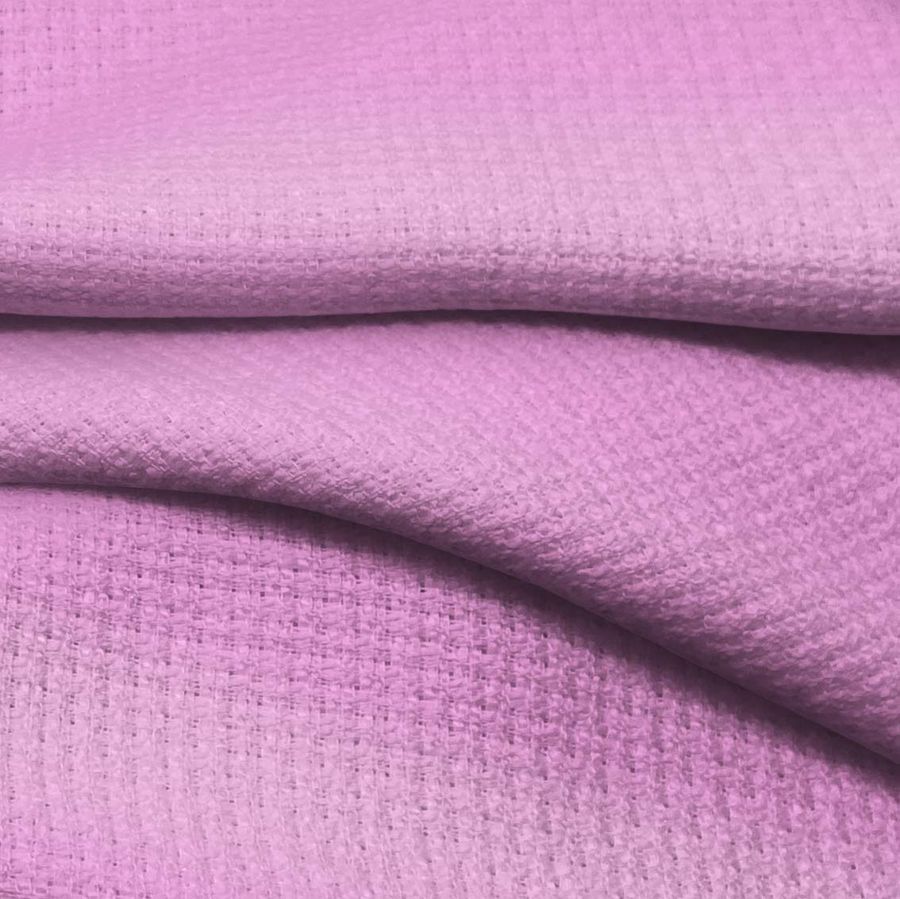 La tela base es un Tweed - Chanel de 100% poliéster con gramaje de 420 gr/m2 y ancho de 150 cm. El color liso impreso es rosa lavanda con CMYK de 9 47 0 0. Este tono evoca la delicadeza y la elegancia, y se combina perfectamente con tonos neutros como beige y gris, así como con tonalidades más intensas como el verde y el morado. Cabe destacar que la tela está impresa con este color liso a una sola cara por impresión digital textil.