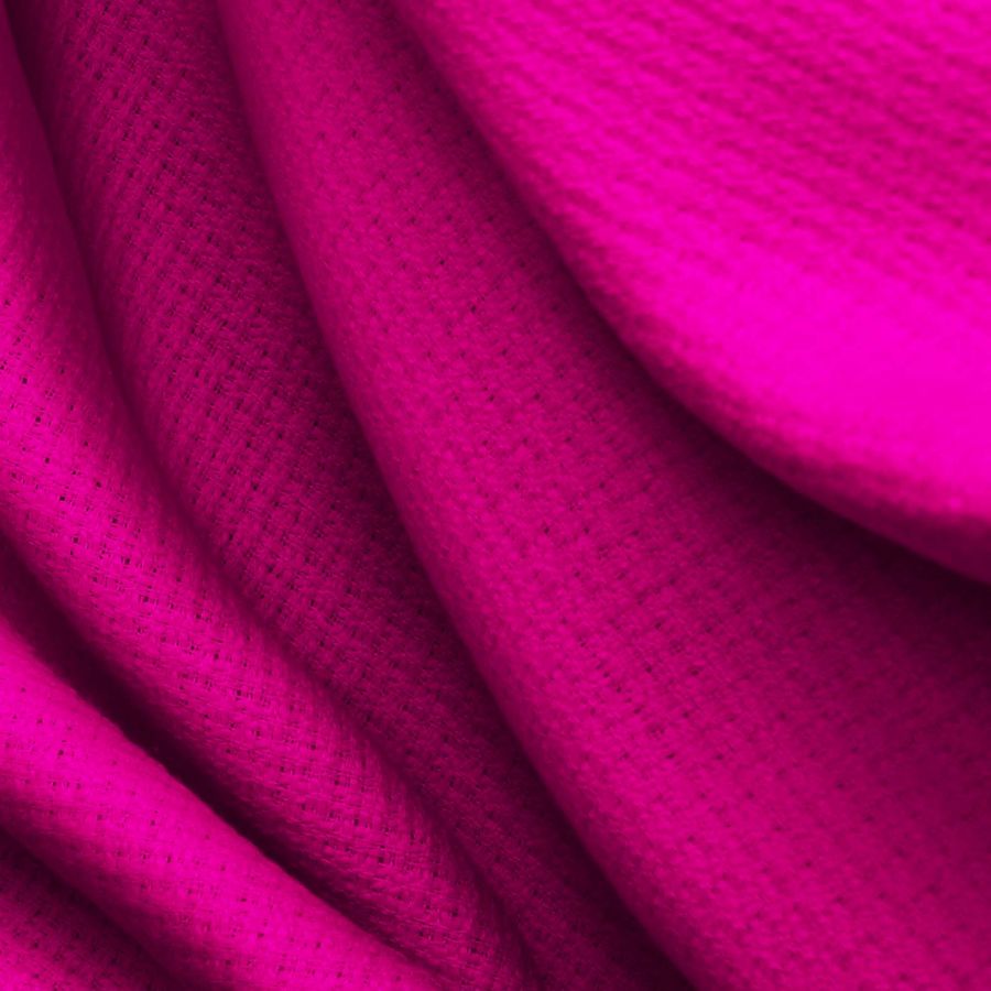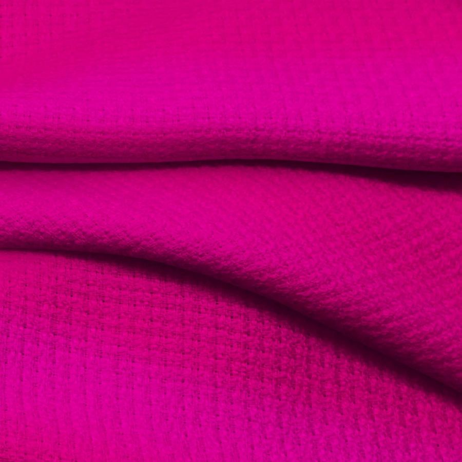 La tela base es un Tweed - Chanel 100% POLIÉSTER con un gramaje de 420 gr/m2 y un ancho de 150 cm. El color liso impreso en la tela es Rosa Mexicano, con un CMYK de 2 98 6 0. Este color es emocionalmente conmovedor y simboliza la esperanza, la felicidad y el optimismo. Es un color vibrante que puede combinarse con tonos neutros como blanco, negro y gris para lograr un contraste elegante. Además, se puede combinar con tonos dorados y plateados para aportar un toque de sofisticación y elegancia a las prendas o accesorios.