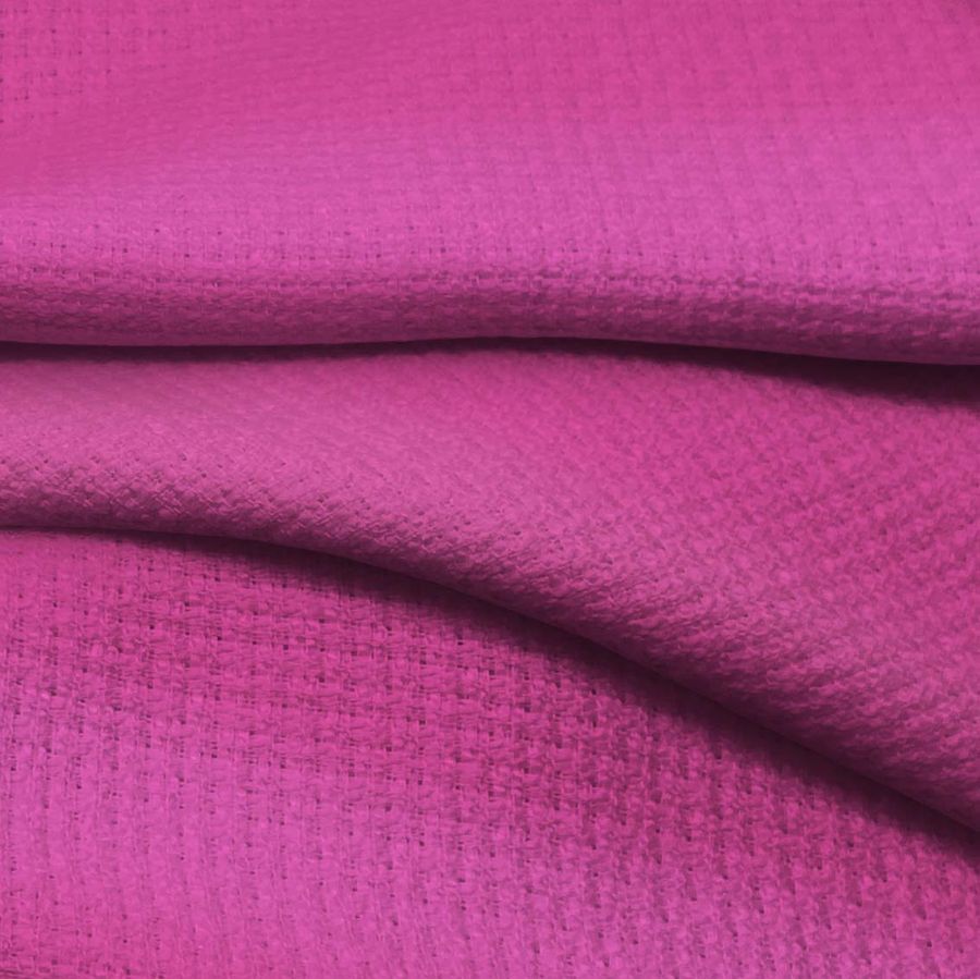 La tela base es un tweed de composición 100% poliéster con un gramaje de 420 gr/m2, con ancho de 150 cm. El color liso impreso es un rosa Pantone con valores de CMYK de 12 83 0 0. Este color se describe como un rosa intenso y vibrante que transmite energía y vitalidad. Combina especialmente bien con tonos de verde y azul.