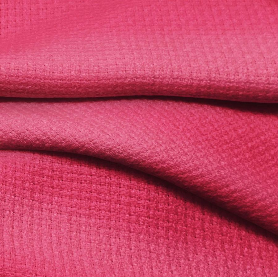 La tela base del Tweed - Chanel es un tejido tweed compuesto al 100% por poliéster con un gramaje de 420 gr/m2 y un ancho de 150 cm. El color liso impreso es Rosa,Paraíso con un CMYK de 1 87 43 0. Este color secundario se caracteriza por su vibrante tonalidad rosa con un matiz de paraíso que lo hace parecer más exótico y tropical. Combina perfectamente con colores como el blanco para dar un efecto más fresco y luminoso, y con el negro para lograr un contraste más sobrio y elegante. Este tejido está impreso con color liso a una sola cara por impresión digital textil, no es un tejido tintado sino impreso.