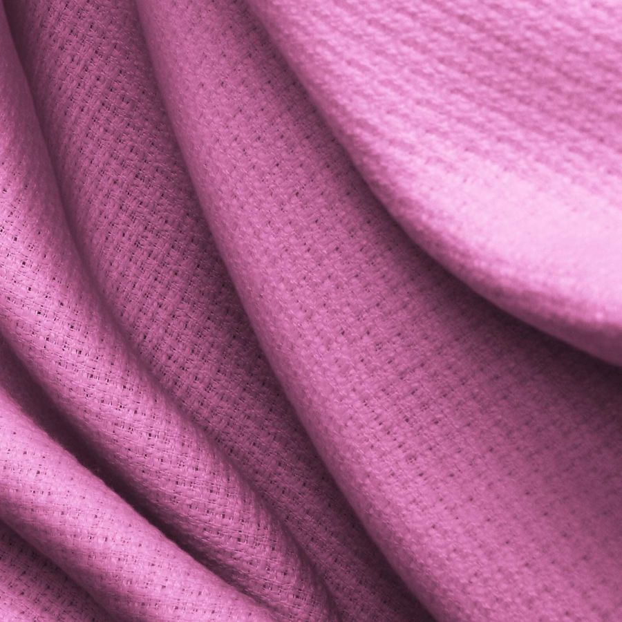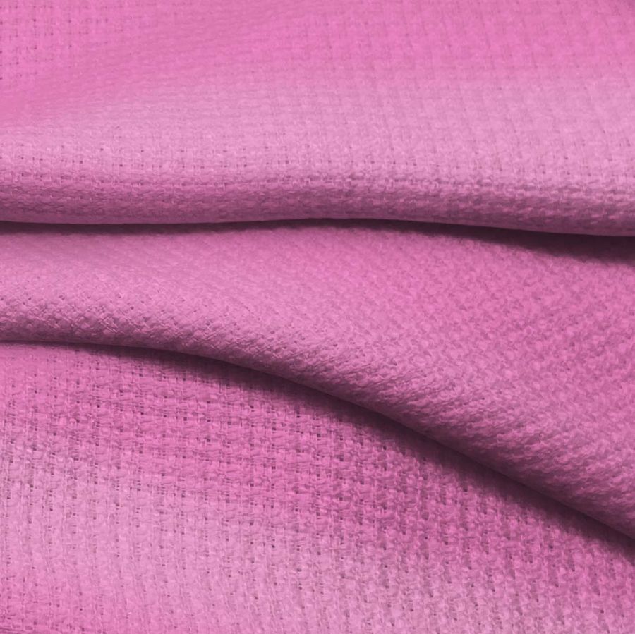 La tela base de este tejido es un Tweed Chanel, un tejido de tipo Tweed compuesto al 100% de poliéster con un gramaje de 420 gr/m2 y un ancho de 150 cm. El color liso impreso es de un tono rosa persa, con una combinación de 3% de tinta cian, 62% de tinta magenta, 0% de tinta amarilla y 0% de tinta negra, lo que da como resultado un CMYK de 3 62 0 0. Este tono de rosa persa es un color femenino y elegante, que se caracteriza por su profundidad y fuerza, y combina con tonos neutros y fríos como el gris, el blanco y el azul.