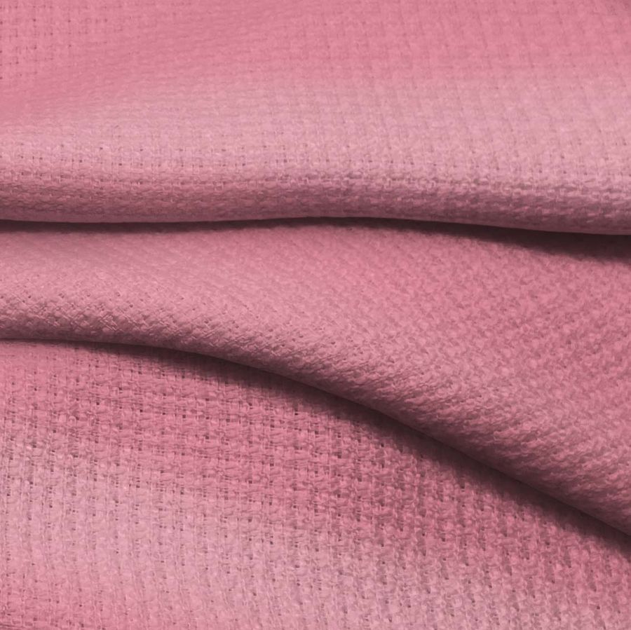 La tela base Tweed-Chanel, de composición 100% poliéster, tiene un gramaje de 420 gr/m2 y un ancho de 150 cm con una impresión lisa a un solo lado con una combinación de color rosa y rosa rosada con un CMYK de 4 58 24 0. El color secundario rosa rosada representa la suavidad, la dulzura y la inocencia, y se combina bien con tonos pasteles como el amarillo, azul claro y verde menta. Es importante destacar que la impresión se realiza por una sola cara mediante impresión digital textil y no se trata de un tejido tintado.