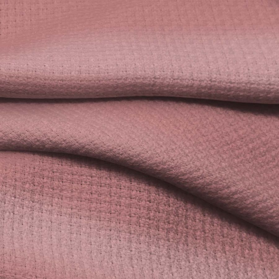 La tela base es un Tweed - Chanel, compuesta por 100% poliéster con un gramaje de 420 gr/m2 y un ancho de 150 cm. Su color liso impreso es un rosa viejo, cuyo CMYK es 21 55 38 9. Este color simboliza la dulzura y la calidez, y se combina perfectamente con colores como el gris, el blanco, el beige y el dorado. El tejido está impreso con este color a una sola cara por impresión digital textil, lo que lo convierte en un material resistente, duradero y de fácil limpieza.