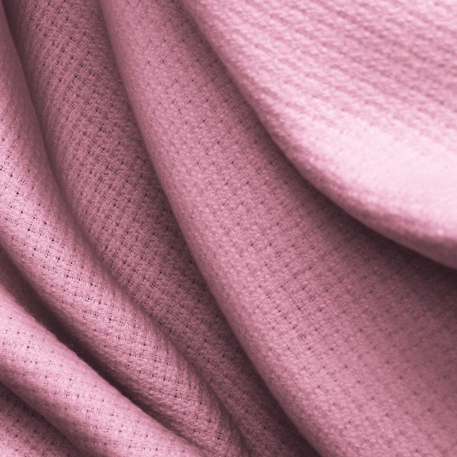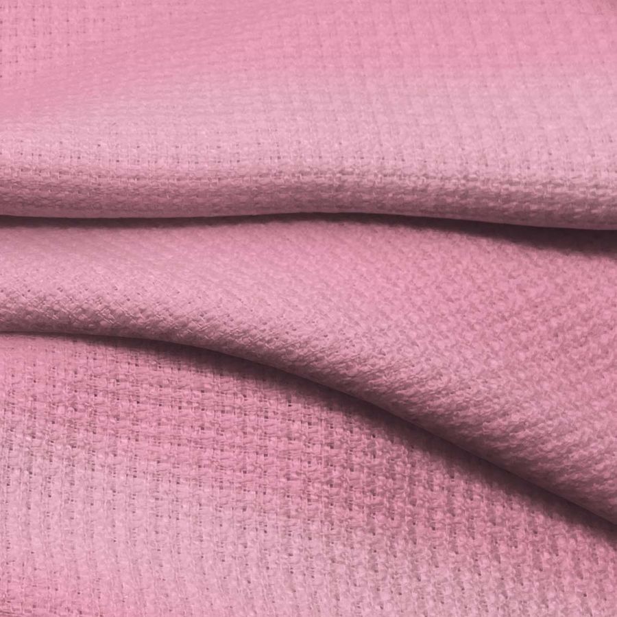 La tela base es un Tweed-Chanel de poliéster con un gramaje de 420 gr/m2 y ancho de 150 cm. El color liso impreso es rosa confite con un valor de CMYK de 0 51 9 0. Este color se describe como un rosa suave y cálido, con un toque delicado y romántico que evoca la dulzura del algodón de azúcar. Combina bien con colores neutros y pasteles, así como con tonos más oscuros como el gris carbón y el negro. Es importante destacar que este tejido está impreso con el color liso a una sola cara por impresión digital textil, lo que significa que no es un tejido tintado sino impreso por una sola cara.