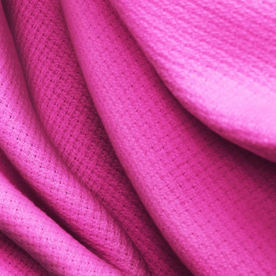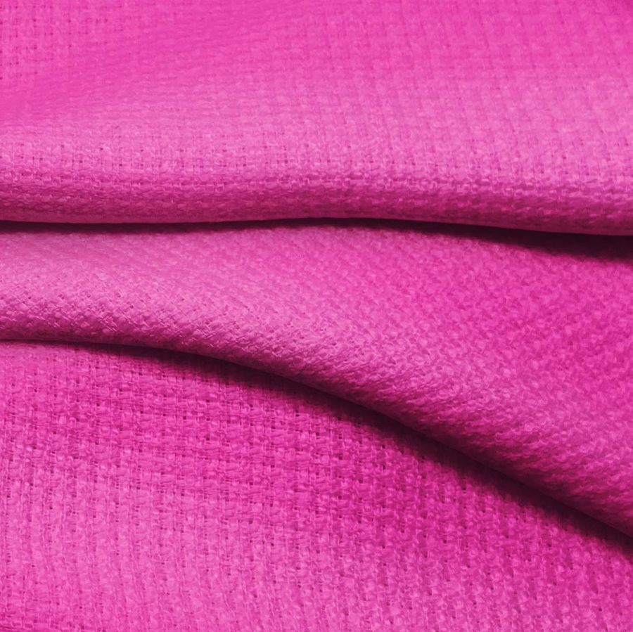 La tela base es el tweed Chanel, un tejido de poliéster con una composición 100% poliéster y un gramaje de 420 gr/m2. Su ancho es de 150 cm y sus cuidados son específicos, como no blanquearlo, no plancharlo a altas temperaturas y no secarlo con secadora. El color liso impreso es el rosa rosé bonbon, con un contenido de tinta cian de 0, tinta magenta de 83, tinta amarilla de 0 y tinta negra de 0. El CMYK del color liso es de 0 83 0 0. Este color transmite alegría y dulzura, es ideal para prendas de mujeres y se combina bien con tonos rosados, grises y dorados. Es importante destacar que la tela está impresa con el color liso en una sola cara por impresión digital textil, no es un tejido tintado sino impreso por una sola cara.