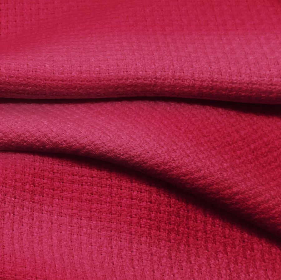 La Tela Tweed - Chanel presenta un color liso impreso en tonos Rosa, Rouge con una composición 22% Cyan, 100% Magenta, 65% Yellow y 17% Black, con un CMYK de 22 100 65 17. Este color transmite una sensación de calor y pasión, con un toque femenino y sofisticado. Combina perfectamente con colores como el gris oscuro, el negro y el blanco, creando una armonía elegante y equilibrada.