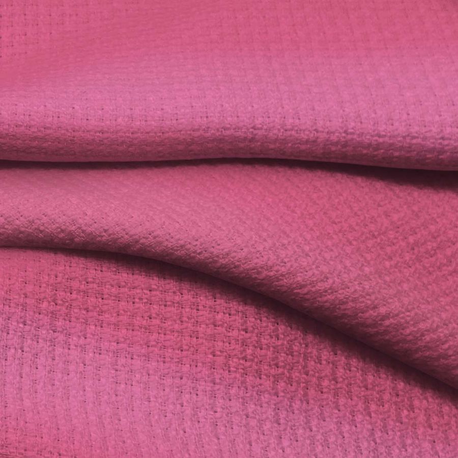 La tela base es un tweed Chanel 100% poliéster con un gramaje de 420 gr/m2 y un ancho de 150 cm. El color liso impreso es una mezcla de rosa y rubor rojo con un CMYK de 8 76 26 0. Es un color suave y elegante que se combina especialmente bien con tonos neutros como el beige o el blanco. El tejido está impreso con el color liso a una sola cara por impresión digital textil.