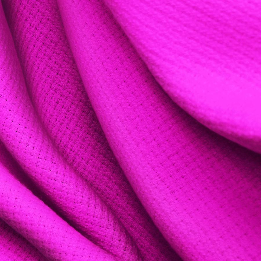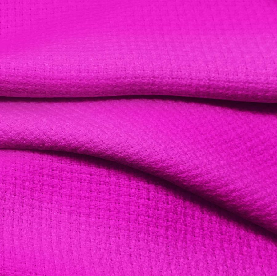 La tela base es un tweed Chanel de 420 gr/m2 y ancho de 150 cm, compuesta por 100% poliéster. El color liso impreso es un rosa shocking (CMYK: 22 83 0 0). Este color se caracteriza por ser vibrante y audaz, simbolizando la pasión y la energía. El rosa shocking es un color secundario derivado de la mezcla del magenta y el amarillo. Este color combina perfectamente con tonos oscuros como el negro, marrón y gris, creando un contraste impactante y sofisticado.