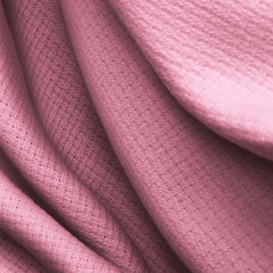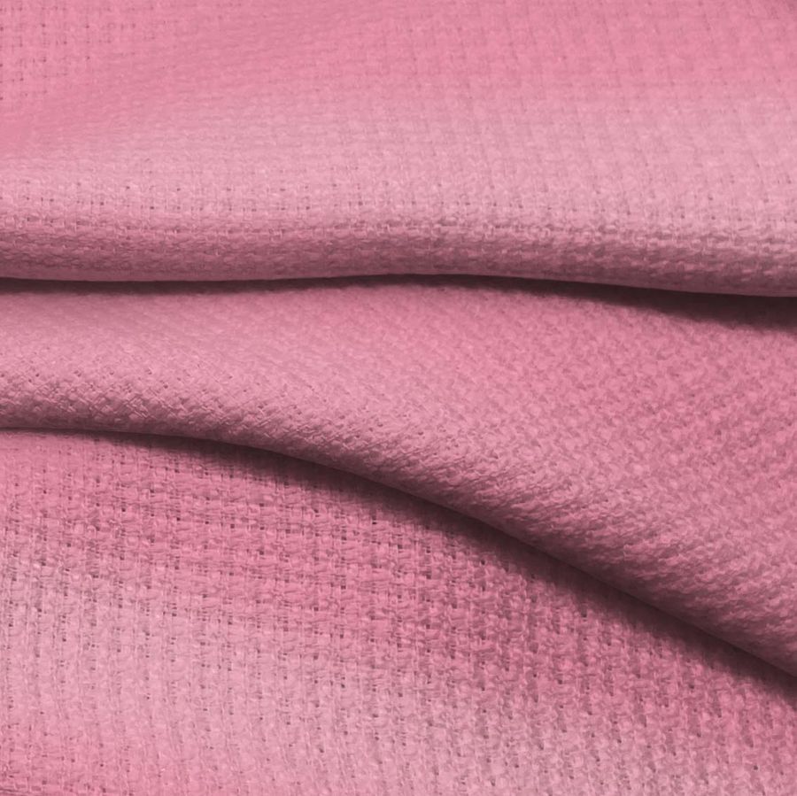 La tela Tweed-Chanel, de 100% poliéster y un gramaje de 420 gr/m2, posee un color liso impreso en tono rosa sorbete. Este color se logra con una combinación de tintas: 0% de cian, 56% de magenta, 16% de amarillo y 0% de negro, con una proporción de CMYK de 0-56-16-0. Este tono aporta una sensación de frescura y juventud, creando un contraste armonioso con la rígida textura de la tela, la cual otorga cierta resistencia y peso.