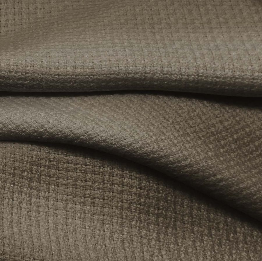 La tela base es el Tweed-Chanel, compuesta por 100% poliéster y con un gramaje de 420 gr/m2. El ancho de la tela es de 150cm y su color liso impreso es un tono de marrón y acicoria con el contenido de CMYK 53 49 62 47, lo que le da un acabado suave y cálido. Este tono se combina bien con otros colores tierra y amarillos claros.