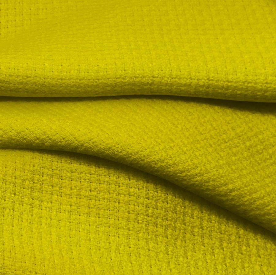 La tela base es Tweed - Chanel, una tela de lana rústica conocida por su textura única y su capacidad de mantener el calor. En este caso, la tela base está hecha al 100% de poliéster con un gramaje de 420 gr/m2 y un ancho de 150 cm. El color impreso es marrón con un toque de amarillo intenso, siendo el CMYK 22 18 98 3. Este color secundario simboliza la fuerza y la vitalidad, y combina especialmente bien con tonos neutros, como el blanco, el negro y el gris. Es importante destacar que este tejido se imprime con el color liso a una sola cara por impresión digital textil, que se trata de un proceso donde la tinta se transfiere directamente al tejido.