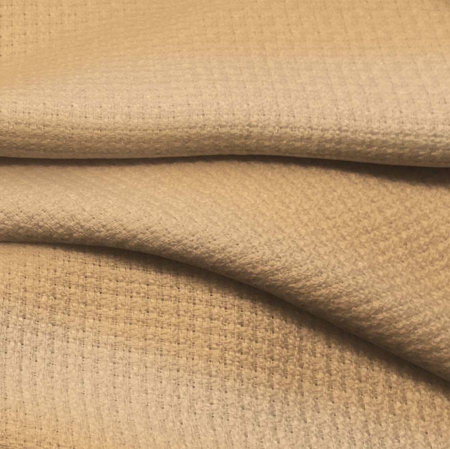 La tela base, Tweed - Chanel, es un tipo de tweed compuesta al 100% de poliéster con un gramaje de 420 gr/m2 y un ancho de 150 cm. El color liso impreso es un marrón caramelo que se obtiene gracias a la impresión digital textil mediante la tecnología de sublimación. El CMYK del color liso indicado es 7 33 56 1, lo que significa que se utiliza una cantidad baja de cian y un alto porcentaje de magenta y amarillo. Este color simboliza la estabilidad, la confianza y el optimismo. Se combina perfectamente con otros tonos tierra como el beige y el marrón, pero también con colores más vivos como los tonos fríos del azul marino y el gris.