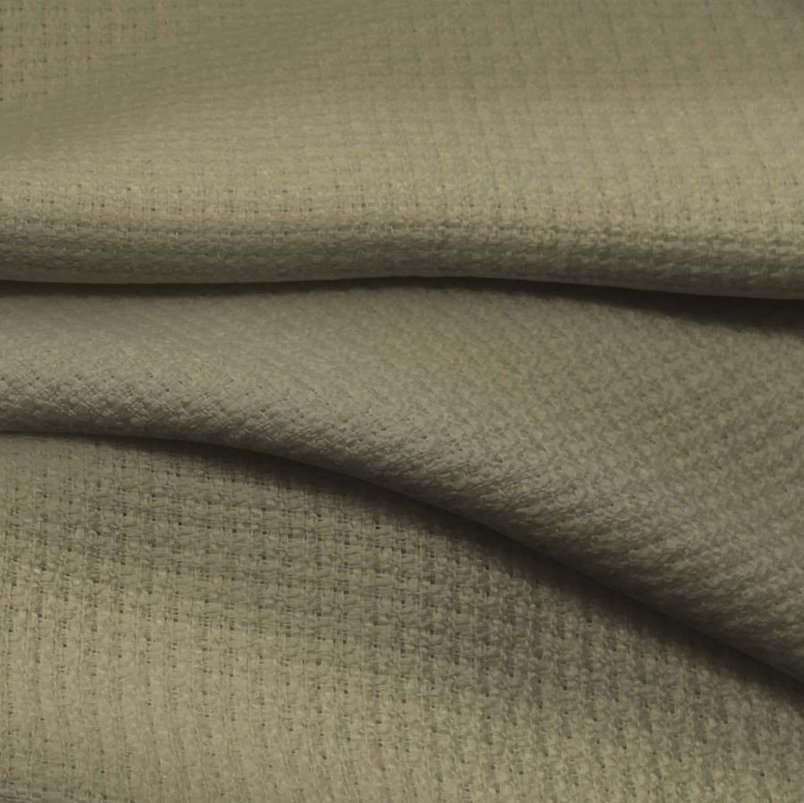 La tela base del tweed Chanel es un tejido de poliéster con un gramaje de 420 gr/m2 y un ancho de 150 cm. El color liso impreso en la tela es marrón- ejército, con un CMYK de 46 38 58 25, que representa un tono terroso con una sensación militar elegante. Este color secundario combina perfectamente con otros tonos neutros como negro, blanco, gris y beige, así como con otros colores de la misma paleta, como azul oscuro y verde oliva.