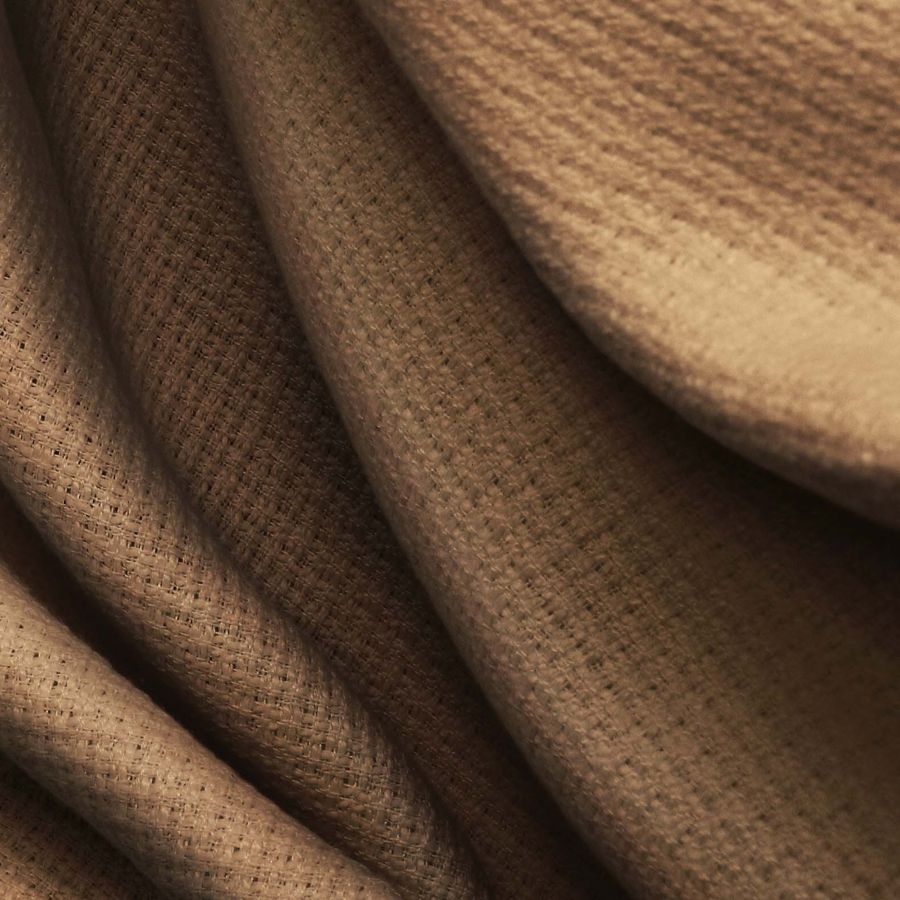 La tela base es un Tweed Chanel de 100% poliéster con un gramaje de 420 gr/m2 y un ancho de 150 cm. Su color liso impreso es un marrón-nogal con un CMYK de 43 58 73 56. Este color secundario simboliza la estabilidad y la profundidad y técnicamente se compone de una mezcla de tonos cálidos y fríos. Combina perfectamente con tonos neutros como el blanco, el beige y el negro, y puede ser utilizado para añadir un toque de sofisticación a tonos más brillantes como el verde esmeralda o el azul claro.
