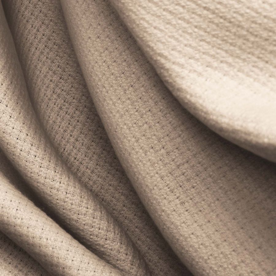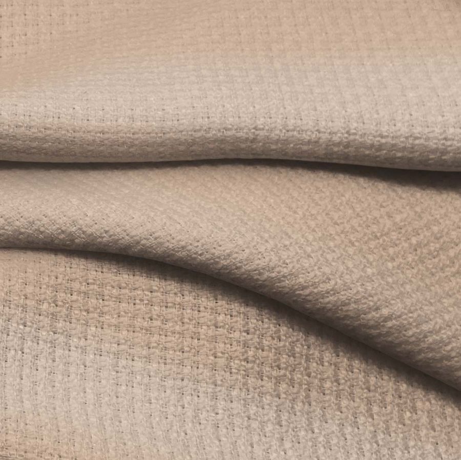 La tela base es un Tweed - Chanel de 100% poliéster de 420 gr/m2 con un ancho de 150 cm. El color liso impreso es un marrón papel de envolver con una combinación de CMYK de 16 30 38 4. El color secundario aporta un toque de calidez y naturalidad, lo que hace que combine perfectamente con otros tonos de marrón, beige y granate. La tela está impresa con el color liso a una sola cara por impresión digital textil.