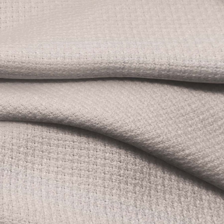 El Tweed Chanel es una tela clásica y elegante compuesta por 100% poliéster con un gramaje de 420 gr/m2 y un ancho de tela de 150 cm. El color liso impreso es marrón-taupe pálido con una combinación de tinta cyan: 12, magenta: 19, yellow: 20 y black: 0, reflejando un tono cálido y suave. La tela proporciona una textura rígida y un tacto consistente.