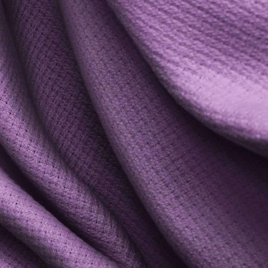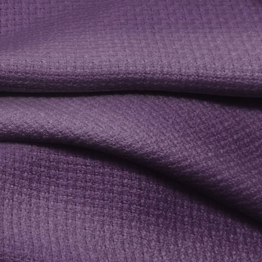 La tela base es el Tweed Chanel, compuesta al 100% de poliéster con un gramaje de 420 gr/m2 y un ancho de 150 cm. El color liso impreso es el Morado Heliotropo Antiguo, cuyo CMYK es 69 78 36 30. Este color es rico y misterioso, transmitiendo una sensación de lujo y elegancia. Simbólicamente, el color morado representa la creatividad, la intuición y la sabiduría. Asimismo, se asocia con la realeza, la nobleza y la extravagancia. El color Heliotropo Antiguo es una variación del morado que contiene tonos de rosa y rojo oscuro, lo que lo hace más cálido y vibrante.