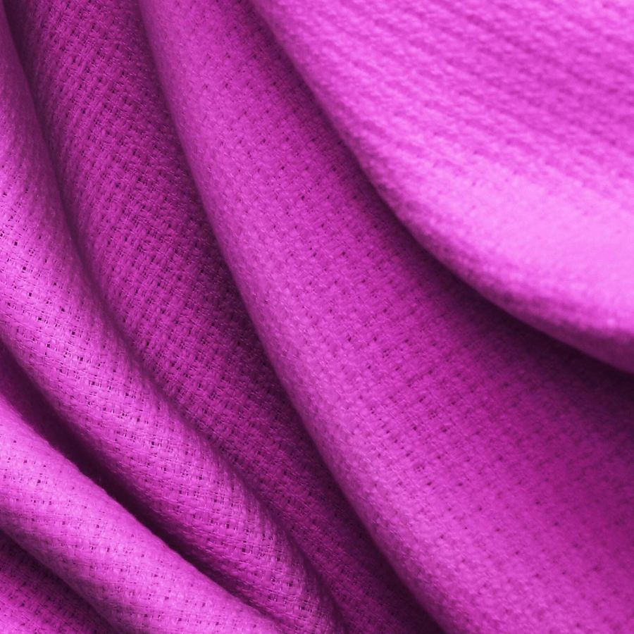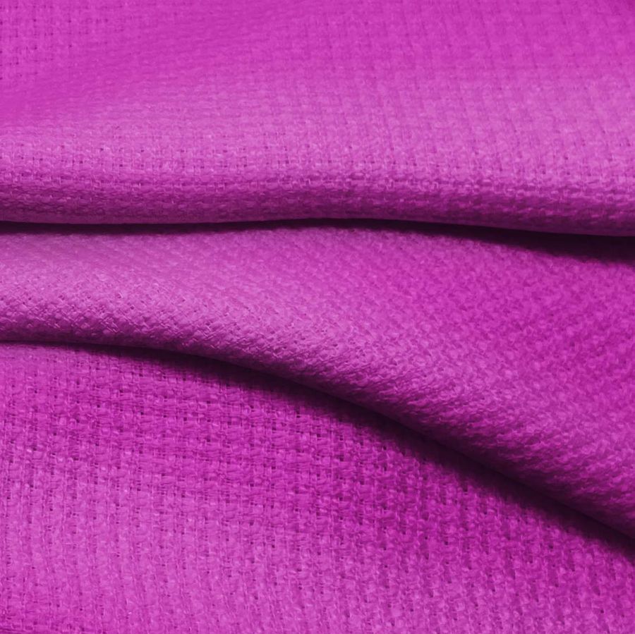 La tela base es el Tweed-Chanel, compuesta por un 100% de poliéster, con un gramaje de 420 gr/m2 y un ancho de 150 cm. El color liso impreso es Morado Bizantino con un CMYK de 39 85 0 0, lo que indica que predominan los tonos magenta y cian. Este color secundario simboliza la realeza, la nobleza y la creatividad. Técnicamente, el morado bizantino es un tono intermedio entre el magenta y el púrpura, que combina con una gran variedad de colores como el amarillo, el marrón o el gris. El tejido está impreso con el color liso a una sola cara por impresión digital textil, lo que significa que no se trata de un tejido tintado, sino impreso por una sola cara utilizando la tecnología de sublimación de poliéster.