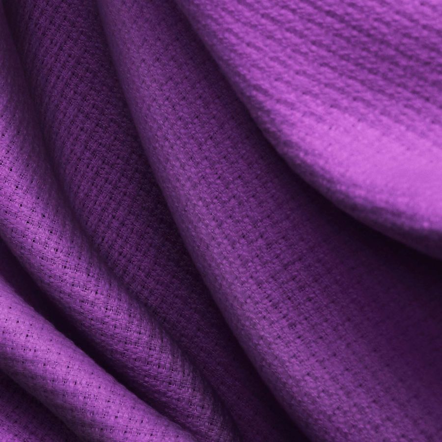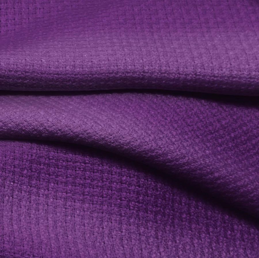 La tela base del tejido es el Tweed-Chanel, una tela tipo tweed que está compuesta por 100% poliéster con un gramaje de 420 gr/m2 y un ancho de tela de 150 cm. El color liso impreso es morado cambur, con los siguientes valores en CMYK: 77% de cian, 100% de magenta, 24% de amarillo y 16% de negro. Este color secundario es un tono vibrante que evoca la frescura y vitalidad de la naturaleza, e combina muy bien con otros colores del mismo espectro como el verde, rosa o azul cielo. Es importante destacar que la tela está impresa con este color a una sola cara mediante impresión digital textil.