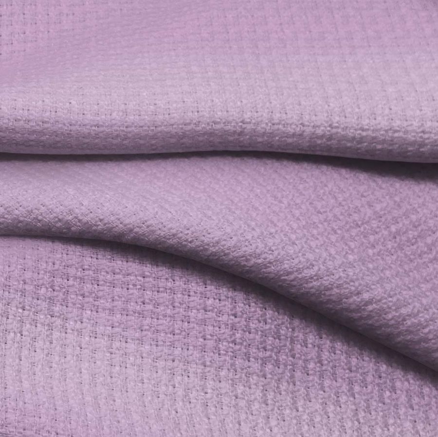 La tela base, Tweed - Chanel, es un tejido de tipo tweed con una composición del 100% poliéster, de un gramaje de 420 gr/m2 y con una anchura de 150 cm. El color liso impreso es un hermoso morado-lila con una combinación de cian y magenta en la tinta, mientras que el amarillo y el negro son relativamente bajos. Este color se combina magníficamente con tonos neutros como el blanco, el gris y el negro, así como con tonos más vivos como el rosa y el verde.