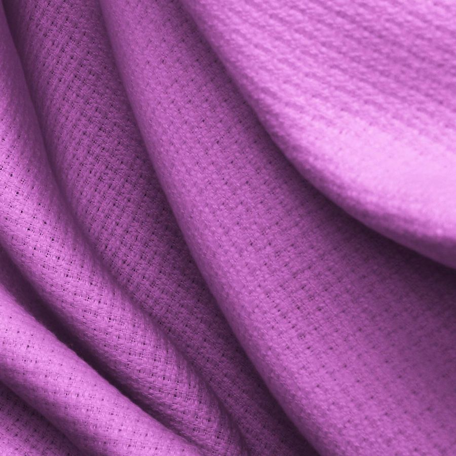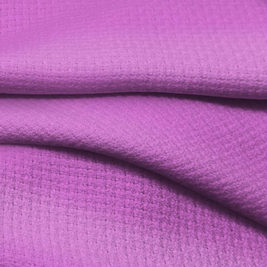 La tela base Tweed - Chanel de 100% poliéster es un tejido tipo tweed de 420 gr/m2 y 150 cm de ancho, en color liso impreso de tonalidad morado y lila orquídea con un CMYK de 30 63 0 0. Este color es simbólico de la creatividad y la espiritualidad, y técnicamente se refiere a una mezcla equilibrada de cian y magenta con ausencia de amarillo y negro.